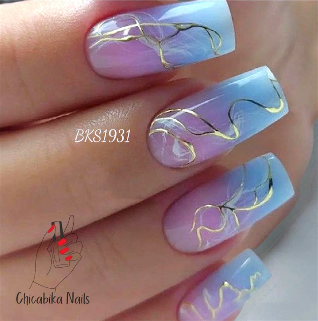 Let your nails capture the glow of a soft sky with Aurora Mist. This elegant set features a blend of dreamy lavender and baby blue hues in a flawless ombré, elevated with delicate marbled veins of gold and black. The long square shape adds a chic modern touch, while the metallic detailing brings in a hint of luxury and movement.