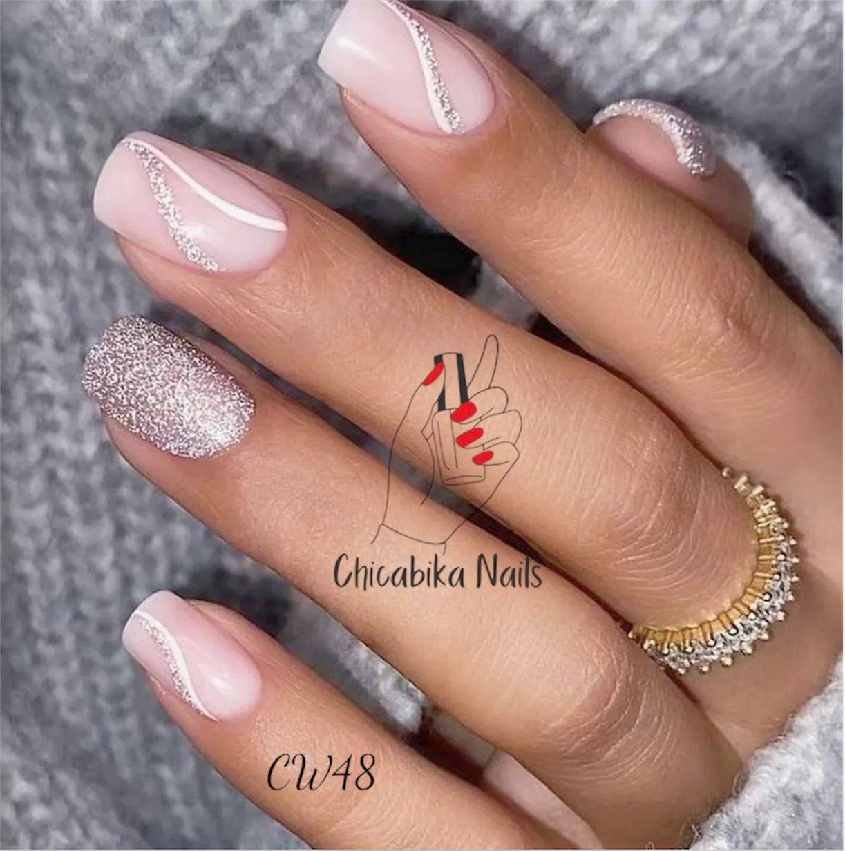 Crystal Whisper is a graceful blend of soft blush pink and white swirl accents, outlined with a touch of silver glitter for a delicate sparkle. One nail is fully encrusted in micro-glitter, creating a statement shimmer that enhances the elegance without overwhelming it. Designed in a short square shape for everyday comfort with bridal-worthy beauty.